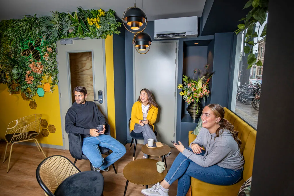 A happy team in a well-designed shared environment that features comfort and warm service